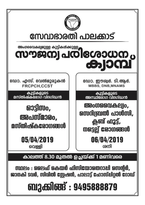 The event is kindly organised by the selfless efforts of people at #Sevabharathi #Palakkad ably guided by Dr. Sreeram Sankar , Biju Bhasker of #LifeCarePhysiotherapyCentre, Palakkad and assisted by Vinod Kumar of NationalOrthotics, #Coimbatore and several other sponsors. Dr. Velmurugan , Pediatric Neurologist would be part of the event on April 5th and Easwar Tr Pediatric Orthopedic Surgeon will take part on April 6th.